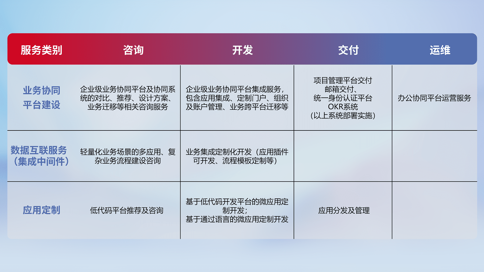 针对钉钉、、、、企微、、、、IDaas等平台级产品提供产品的规划、、、方案、、交付、、、、定制化开发等服务,,,实现如统一协同办公、、智能客户服务、、、混合会议管理、、智能数据查询、、、等业务场景,,,实现数字化转型。。。